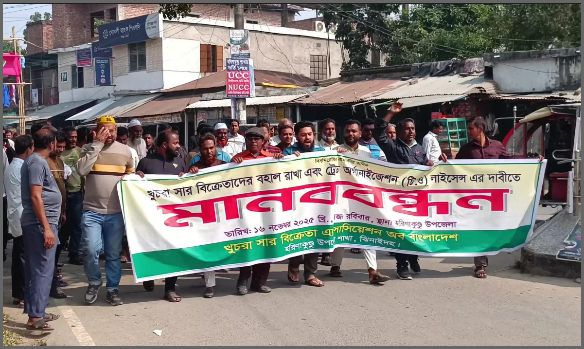 ১৬ নভেম্বর রবিবার সকালে হরিণাকুন্ডু উপজেলা মোড়ে এ কর্মসূচীর আয়োজন করে খুচরা সার বিক্রেতা এ্যাসোসিয়েশন অব বাংলাদেশ। এতে ব্যানার ফেস্টুন নিয়ে  উপজেলার বিভিন্ন এলাকার খুচরা সার বিক্রেতারা অংশ নেয়।