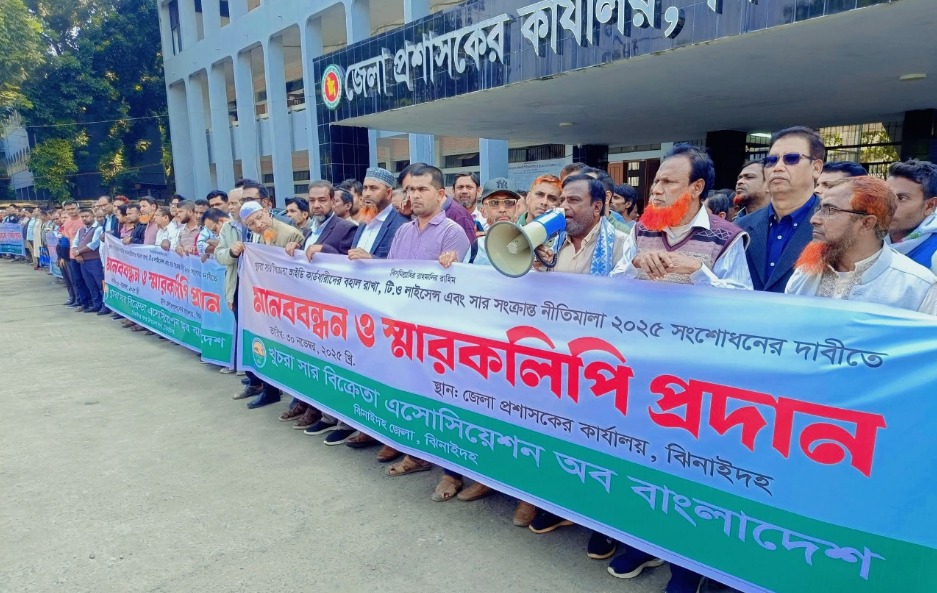 এম   কবীর, ঝিনাইদহ : খুচরা সার বিক্রেতা আইডি কার্ডধারীদের বহাল রাখা, টি.ও লাইসেন্স এবং সার সংক্রান্ত নীতিমালা ২০২৫ সংশোধনের দাবীতে ঝিনাইদহে মানববন্ধন ও স্মারকলিপি প্রদান করা হয়েছে।