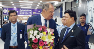 বৃহস্পতিবার সন্ধ্যা ৬টা ১৭ মিনিটে সের্গেই ল্যাভরভকে ফুলের তোড়া দিয়ে বিমানবন্দরে অভ্যর্থনা জানান বাংলাদেশের পররাষ্ট্রমন্ত্রী ড. এ কে আব্দুল মোমেন।