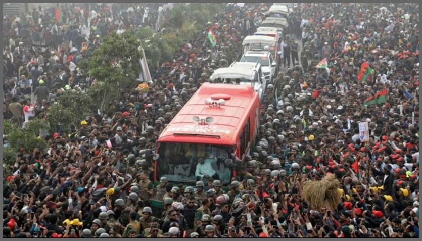 বিমানবন্দর থেকে রাজধানীর ৩০০ ফিটে সংবর্ধনা অনুষ্ঠানে যাওয়ার পথে বাসে তারেক রহমান