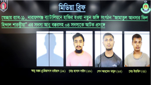 নারায়ণগঞ্জ র‌্যাব-১১ ব্যাটালিয়ন কার্যালয়ে স্বেচ্ছায় হাজির হওয়া নতুন জঙ্গি সংগঠন ‘জামাতুল আনসার ফিল হিন্দাল শারক্বীয়া’ সদস্য রাইয়ানসহ চার তরুণকে আটকের পর এসব তথ্য জানিয়েছে র‌্যাব।